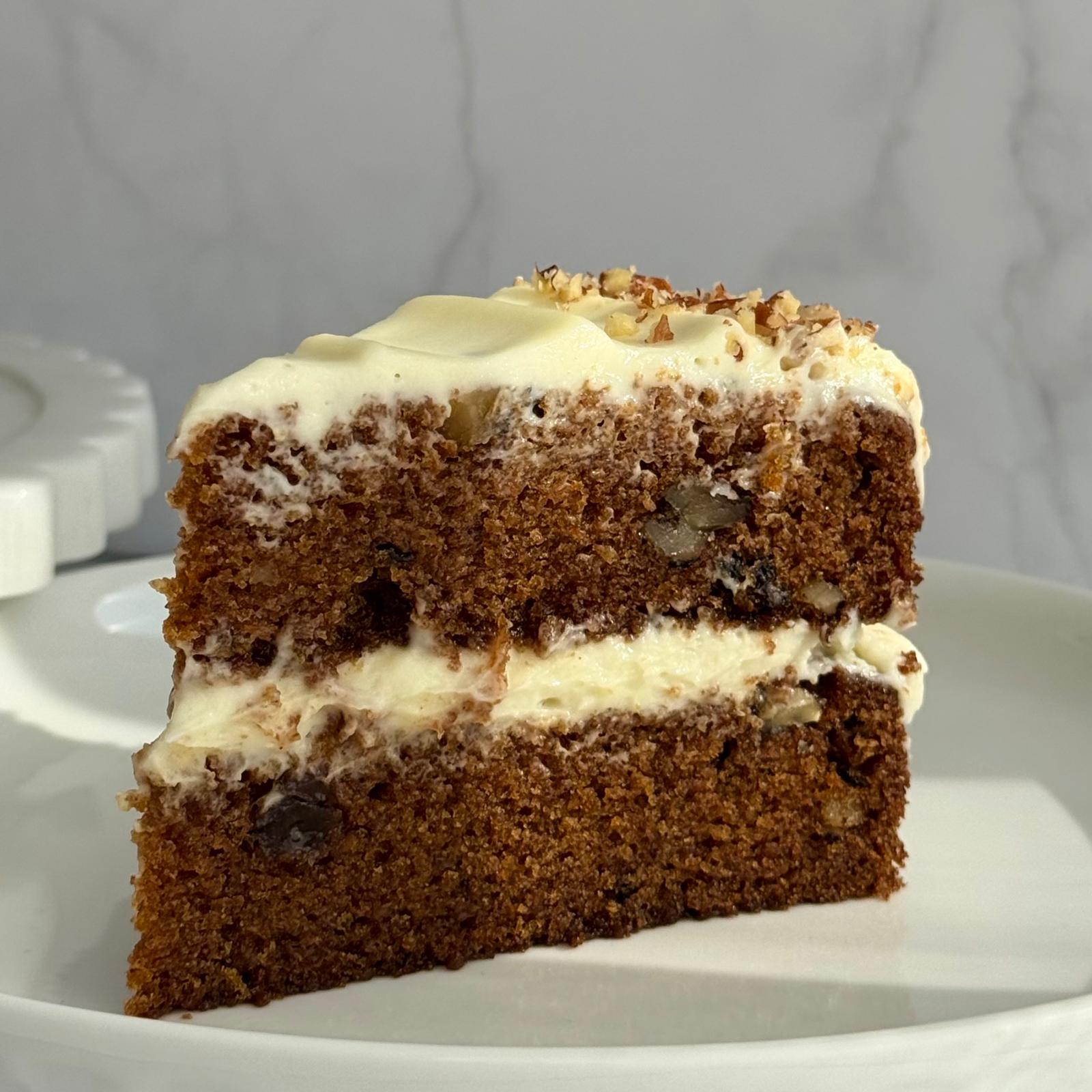 A carrot cake made with freshly grated carrots, walnuts, and raisins, layered with smooth cream cheese frosting. Soft, moist, and comforting—perfect for sharing.